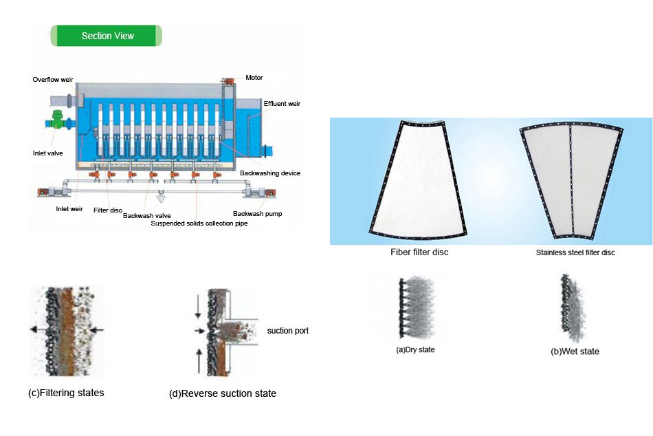 This rotary disc filter consists of multiple filter discs arranged horizontally, each with a fan-shaped filter plate covered by a fiber filter cloth with 10 μm openings. Its operating procedures involve filtration, backwash and sludge discharge.