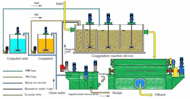 · After the coagulation, the water containing the magnetic flocs flows into a super magnetic separation device. Here, a magnetic disk isolates and purifies the magnetic flocs from the rest of the water. This process enables the purification and separation of the magnetic flocs from the water, which can then be discharged or reused.
