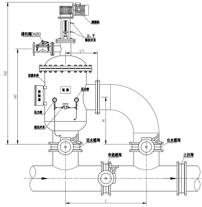 污水在排污時(shí)通過排污口排出,壓差開關(guān)持續(xù)檢測(cè)濾網(wǎng)內(nèi)外的壓差,當(dāng)達(dá)到預(yù)設(shè)值時(shí)將傳遞一個(gè)開關(guān)信號(hào)到控制箱啟動(dòng)一次清洗循環(huán)。