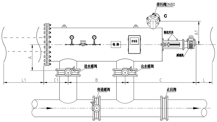 采用工業單片PLC自動控制,中文或英文。可根據壓差或定時控制過濾器自動清洗,并可手動、強制清洗。現場可設定過濾時間、清洗時間。運行信號、清洗信號、故障信號輸出及485通訊接口。