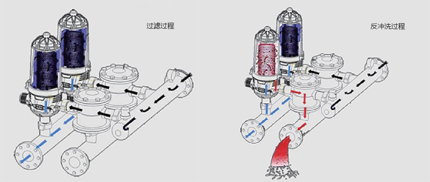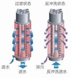 過濾系統有兩種運行狀態:過濾狀態和反沖洗狀態。