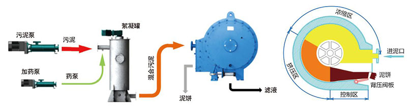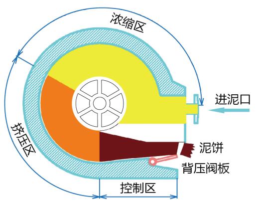 含泥污水通過藥劑調理后進入污泥通道,污泥在環形的通道內被鉆有小孔的濾板低速帶動,隨著通道容積逐漸收縮,水分從兩側濾孔排出。在進口推力和濾網摩擦力的作用下,污泥不斷被推向出口,由于末端擋門提供可調節背壓,使更多水分被擠出,在達到脫水目的后污泥由擋門開口處不斷排出。
